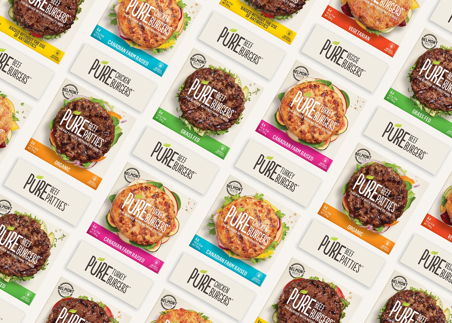 Research quickly showed us that in a world of frozen burgers, every package design seems to highlight the same thing: the bun! Packaging was filled with bun-heavy imagery and complex messaging. We went the opposite direction: It doesn’t get any simpler than a brand name like Pure Burger. The package design reflects this simplicity and takes a bold approach. Minimal messaging and a bright colour palette have the products popping, distinct in a freezer full of sameness. Custom-shot images showcase the actual product – not a bun – and print techniques were used to give the products a premium feel.