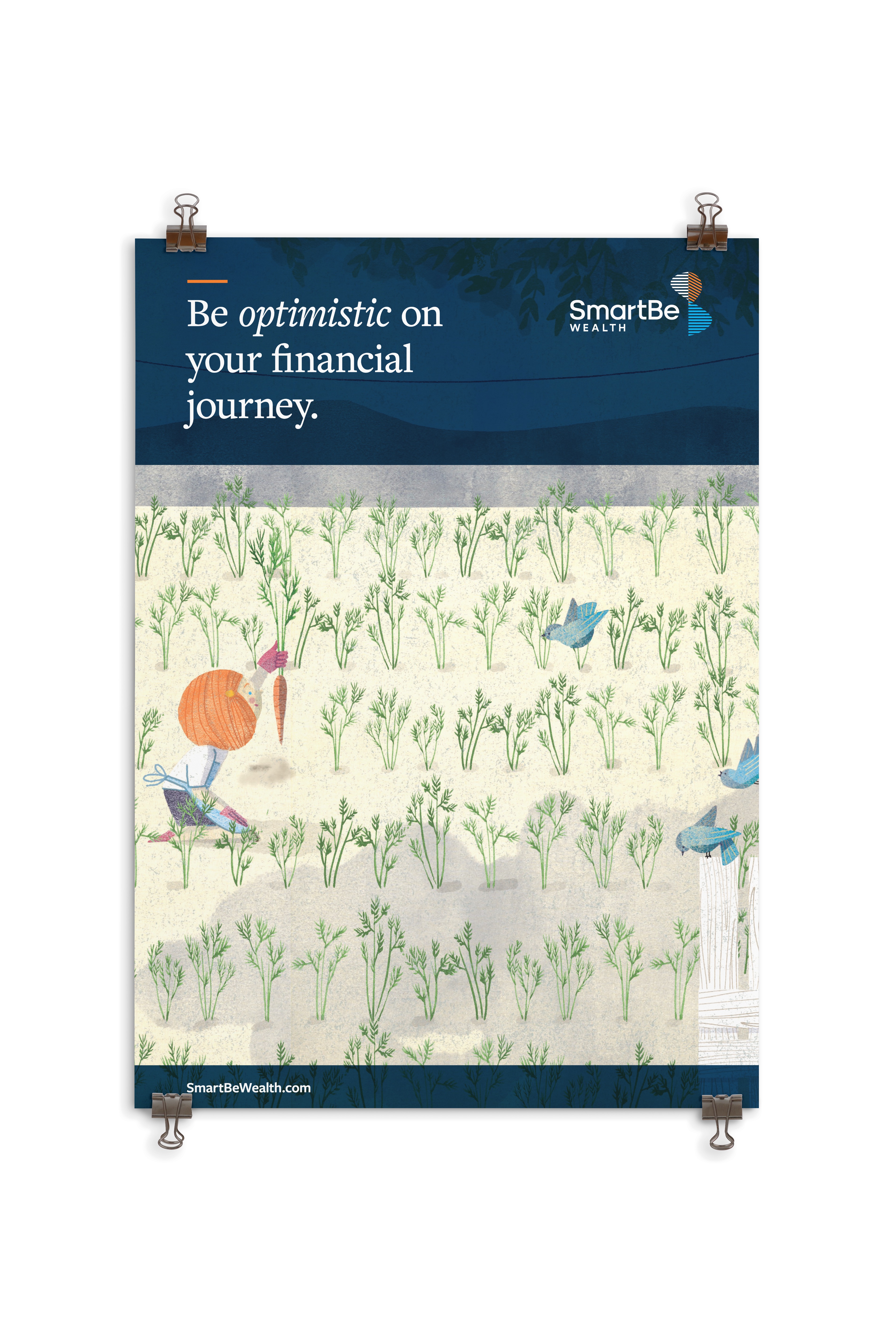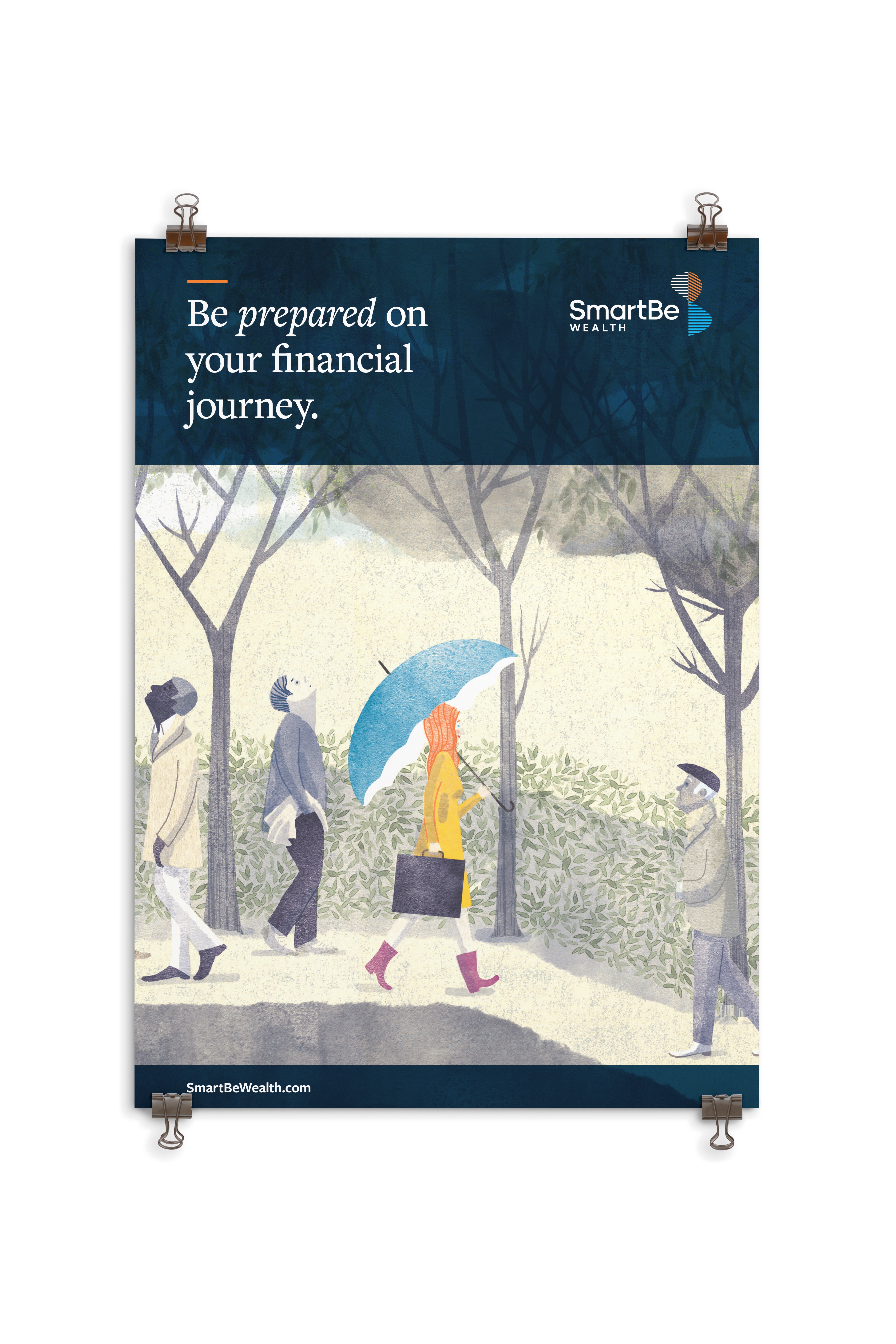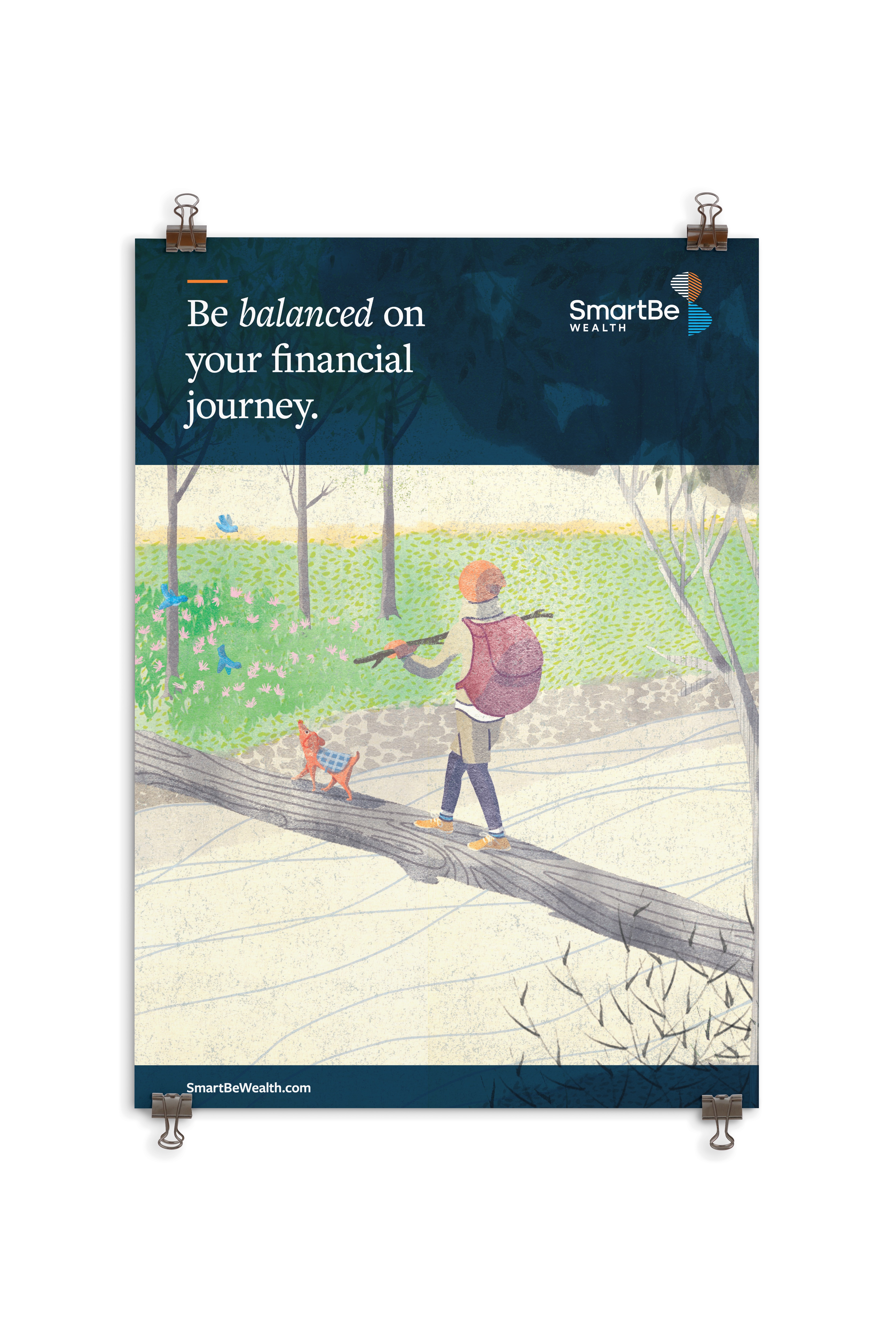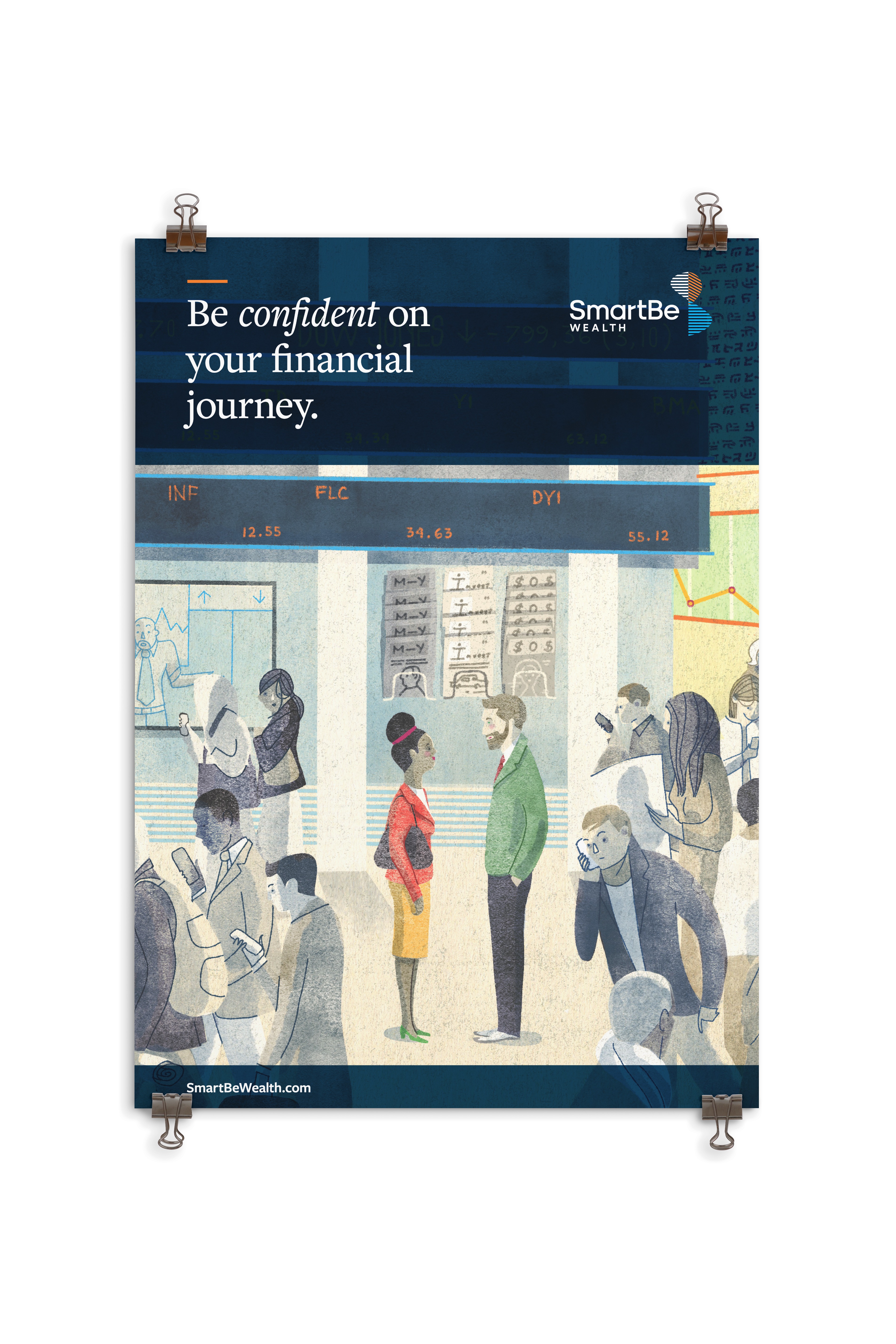We looked through a range of brand name possibilities, and SmartBe helped get their platform across – an unbiased AI, with a message that feels human: be smart with your finances. The brand identity was then developed to further support this twofold AI/human approach. The logo’s symbol reflects a sine wave pattern, representing the unseen AI always at work, and the supportive brand imagery uses custom illustrations to communicate a hands-on, human approach and understanding.